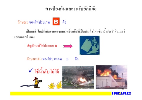 28 การป้องกันและระงับอัคคีภัย ็ เปนเพลิงไหม้ทีjเกิดจากของเหลวหรือแก๊สทีjเปนสารไวไฟ เช่น นํHามัน สี ทินเนอร์ ลักษณะเด่น ของไฟประเภท B คือ ลักษณะ ของไฟประเภท คือ ใช้นํHาดับไม่ได ใช้นํHาดับไม่ได้ ้ สัญลักษณ์ไฟประเภท B แอลกอฮอล์ ฯลฯ ็