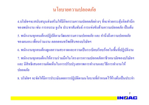 7. พนักงานทุกคนต้องให้ความร่วมมือในโครงการความปลอดภัยอาชีวอนามัยของบริษัทฯ