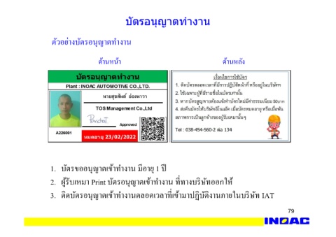 79 ด้านหลัง บัตรอนุญาตทํางาน ี ผู้รับเหมา Print บัตรอนุญาตเข้าทํางาน ทีDทางบริษัทออกให้ ติดบัตรอนุญาตเข้าทํางานตลอดเวลาทีDเข้ามาปฏิบัติงานภายในบริษัท IAT ตัวอย่างบัตรอนุญาตทํางาน ด้านหน้า บัตรขออนุญาตเข้าทํางาน มีอายุ 1 ป 1. 2. 3.