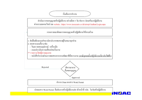 เริDมต้นการทํางาน ดําเนินการขออนุญาตเข้าปฏิบัติงาน อย่างน้อย 5 วัน ทําการ ก่อนเข้ามาปฏิบัติงาน ผ่านระบบออนไลน์ บน website : https://www.inoacauto.co.th/iatwpt/Authen/Login.aspx กรอกรายละเอียดการขออนุญาตเข้าปฏิบัติงานให้ครบถ้วน - หนังสือรับรองผ่านการทดสอบจากกรมพัฒนาฝีมือแรงงาน (กรณีบุคคลนัHนปฏิบัติงานเกีjยวกับไฟฟ้า) พิจารณาการ ยืDนขออนุญาต Approved Print เอกสาร Work Permit นําเอกสาร Work Permit ยืนยันการเข้าปฏิบัติงานต่อ เจ้าหน้าทีD รปภ.