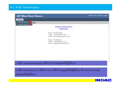 IAT Work Permit Request อนุญาตเข้าปฏิบัติงาน 1 2 1. เลือก Work permit Request เพืDอทําการขออนุญาตเข้าปฏิบัติงาน 2. เลือก Work permit List เพืDอทําการตรวจเช็คใบอนุญาตเข้าปฏิบัติงาน หรือ Print เอกสารขอ