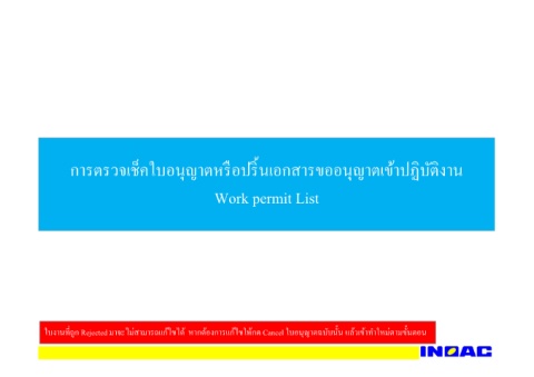 การตรวจเช็คใบอนุญาตหรือปริXนเอกสารขออนุญาตเข้าปฏิบัติงาน Work permit List ใบงานทีDถูก Rejected มาจะไม่สามารถแก้ไขได้ หากต้องการแก้ไขให้กด Cancel ใบอนุญาตฉบับนัXน แล้วเข้าทําใหม่ตามขัXนตอน
