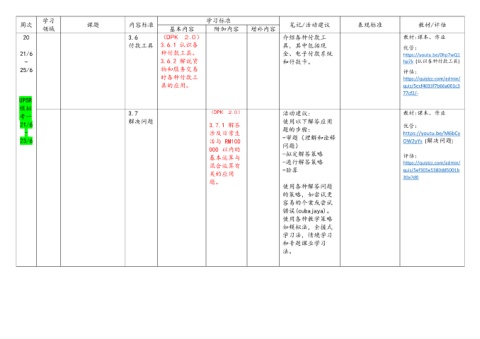 周次 课题 内容标准 笔记/活动建议 表现标准 教材/评估