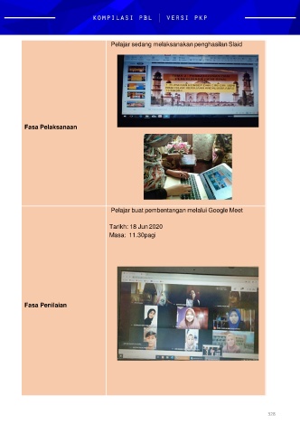 Pelajar sedang melaksanakan penghasilan Slaid Fasa Pelaksanaan Pelajar buat pembentangan melalui Google Meet Tarikh: 18 Jun 2020 Masa: 11.30pagi Fasa Penilaian 328
