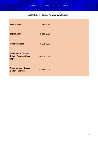 LAMPIRAN III: Jadual Pelaksanaan Tugasan Tarikh Mula 11 Mei 2020 Tarikh Akhir 15 Mei 2020 Pembentangan 18 Jun 2020 Penghataran Semua Bahan Tugasan (hard 24 Jun 2020 copy) Penghantaran Semua Bahan Tugasan 24 Mei 2020 333