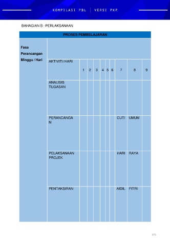 BAHAGIAN B : PERLAKSANAAN PROSES PEMBELAJARAN Fasa Perancangan Minggu / Hari AKTIVITI/ HARI 1 2 3 4 5 6 7 8 9 ANALISIS TUGASAN PERANCANGA CUTI UMUM N PELAKSANAAN HARI RAYA PROJEK PENTAKSIRAN AIDIL FITRI 375