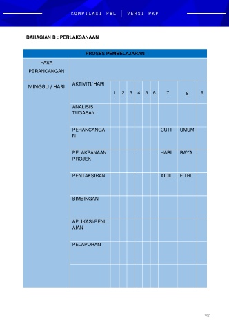BAHAGIAN B : PERLAKSANAAN PROSES PEMBELAJARAN FASA PERANCANGAN AKTIVITI/ HARI MINGGU / HARI 1 2 3 4 5 6 7 8 9 ANALISIS TUGASAN PERANCANGA CUTI UMUM N PELAKSANAAN HARI RAYA PROJEK PENTAKSIRAN AIDIL FITRI BIMBINGAN APLIKASI/PENIL AIAN PELAPORAN 390