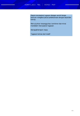 Dapat menyiapkan tugasan dengan sendiri tanpa bantuan mengikut jadual pelaksanaan dengan tepatdan kemas. Menunjukkan kesungguhan, komitmen danminat mendalam menyiapkan tugasan. Menepati tempoh masa Tugasan kemas dan kreatif 396
