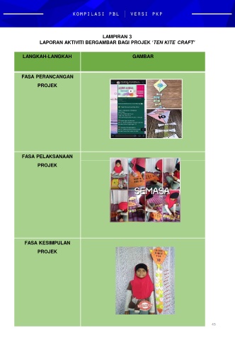 LAMPIRAN 3 LAPORAN AKTIVITI BERGAMBAR BAGI PROJEK ‘TEN KITE CRAFT’ LANGKAH-LANGKAH GAMBAR FASA PERANCANGAN PROJEK FASA PELAKSANAAN PROJEK FASA KESIMPULAN PROJEK 43