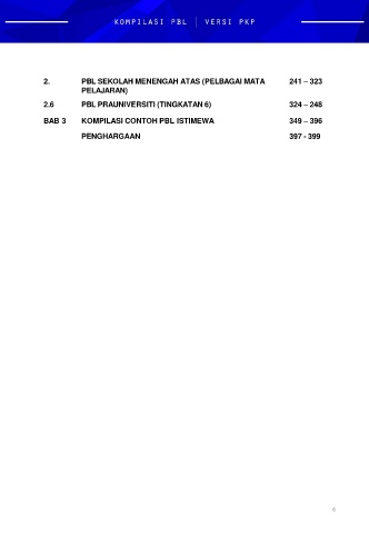 2.5 PBL SEKOLAH MENENGAH ATAS (PELBAGAI MATA 241 – 323 PELAJARAN) 2.6 PBL PRAUNIVERSITI (TINGKATAN 6) 324 – 248 BAB 3 KOMPILASI CONTOH PBL ISTIMEWA 349 – 396 PENGHARGAAN 397 - 399 6
