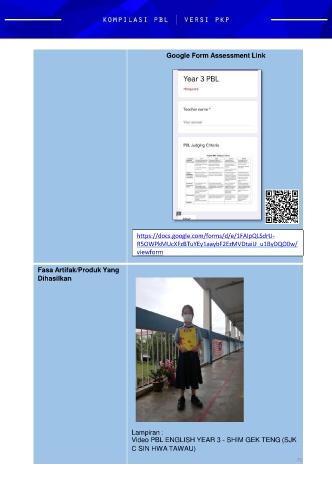 Google Form Assessment Link https://docs.google.com/forms/d/e/1FAIpQLSdrU- R5OWPkMUcXFzBTuYEy1aaybF2EzMVDtaiU_u1ByDQO0w/ viewform Fasa Artifak/Produk Yang Dihasilkan Lampiran : Video PBL ENGLISH YEAR 3 - SHIM GEK TENG (SJK C SIN HWA TAWAU) 75