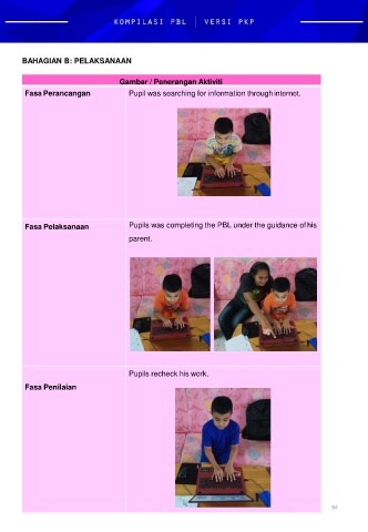 BAHAGIAN B: PELAKSANAAN Gambar / Penerangan Aktiviti Fasa Perancangan Pupil was searching for information throughinternet. Fasa Pelaksanaan Pupils was completing the PBL under the guidance of his parent. Pupils recheck his work. Fasa Penilaian 94