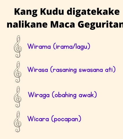 Kang Kudu digatekake nalikane Maca Geguritan Wirama (irama/lagu) Wirasa (rasaning swasana ati) Wiraga (obahing awak) Wicara (pocapan)