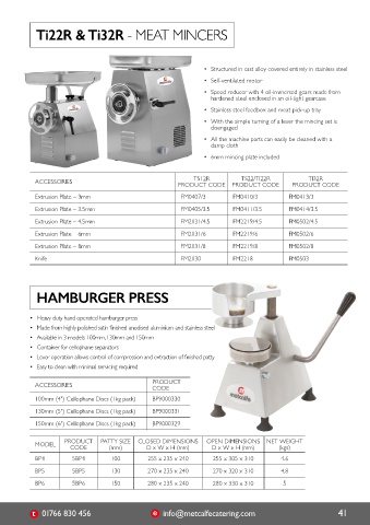 • Stainless steel tray and hopper • Heavy duty hand operated hamburger press