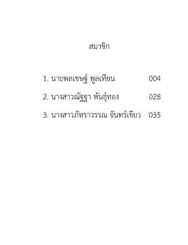 สมาชิก 1. นายพลเชษฐ์ พูลเทียน 004 2. นางสาวณัฐฐา พันธุ์ทอง 028 3. นางสาวภัทราวรรณ จันทร์เขียว 035