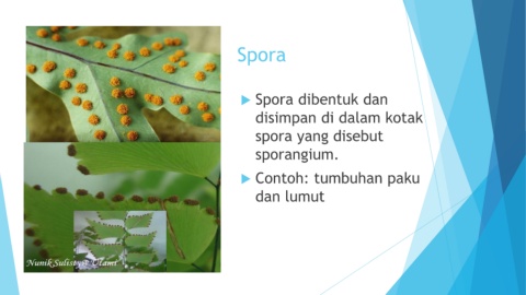 Spora Spora dibentuk dan disimpan di dalam kotak spora yang disebut sporangium. Contoh: tumbuhan paku dan lumut