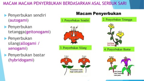 MACAM MACAM PENYERBUKAN BERDASARKAN ASAL SERBUK SARI Penyerbukan sendiri (autogami) Penyerbukan tetangga(geitonogami) Penyerbukan silang(allogami / xenogami) Penyerbukan bastar (hybridogami)