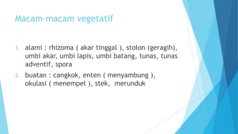 Macam-macam vegetatif 1. alami : rhizoma ( akar tinggal ), stolon (geragih), umbi akar, umbi lapis, umbi batang, tunas, tunas adventif, spora 2. buatan : cangkok, enten ( menyambung ), okulasi ( menempel ), stek, merunduk
