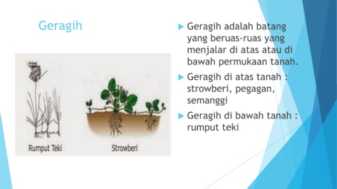 Geragih Geragih adalah batang yang beruas-ruas yang menjalar di atas atau di bawah permukaan tanah. Geragih di atas tanah : strowberi, pegagan, semanggi Geragih di bawah tanah : rumput teki