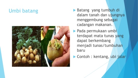 Umbi batang Batang yang tumbuh di dalam tanah dan ujungnya menggembung sebagai cadangan makanan. Pada permukaan umbi terdapat mata tunas yang dapat berkembang menjadi tunas/tumbuhan baru Contoh : kentang, ubi jalar