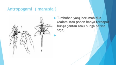 Antropogami ( manusia ) Tumbuhan yang berumah dua (dalam satu pohon hanya terdapat bunga jantan atau bunga betina saja)