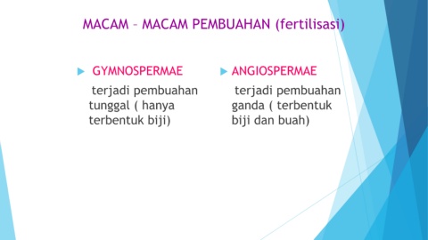 MACAM – MACAM PEMBUAHAN (fertilisasi) GYMNOSPERMAE ANGIOSPERMAE terjadi pembuahan terjadi pembuahan tunggal ( hanya ganda ( terbentuk terbentuk biji) biji dan buah)