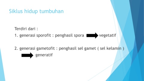 Siklus hidup tumbuhan Terdiri dari : 1. generasi sporofit : penghasil spora vegetatif 2. generasi gametofit : penghasil sel gamet ( sel kelamin ) generatif