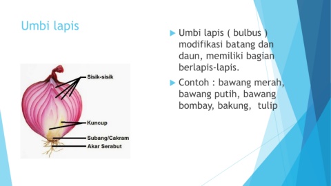 Umbi lapis Umbi lapis ( bulbus ) modifikasi batang dan daun, memiliki bagian berlapis-lapis. Contoh : bawang merah, bawang putih, bawang bombay, bakung, tulip