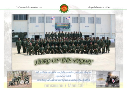 โรงเรียนเสนารักษ์ กรมแพทย์ทหารบก หลักสูตรชนต้น เหล่า พ. รุ่นที่ 20 ั้ We will not abandon our fellow soldiers, whether they are injured or killed. ื ิ ็ เราจะไม่ทอดทิ้งเพอนทหารไม่ว่าจะบาดเจบ หรอ เสียชีวต ื่