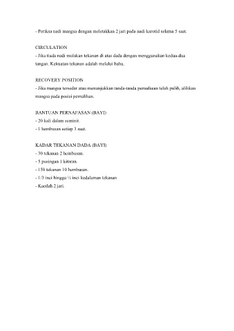 - Periksa nadi mangsa dengan meletakkan 2 jari pada nadi karotid selama 5 saat.