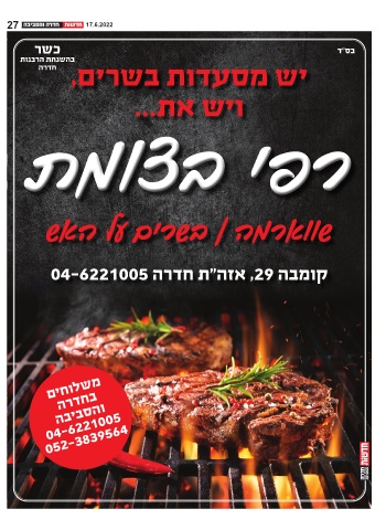 27 17.6.2022 כשר בס"ד בהשגחת הרבנות חדרהיש מסעדות בשרים, ויש את... רפי בצומת שווארמה | בשרים על האש קומבה ,29אזה"ת חדרה 04-6221005 50654ו90המ31בס82שחב32לדיו6-רב2-חהיה54ם00
