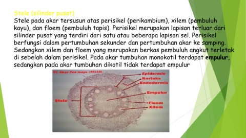 Stele pada akar tersusun atas perisikel (perikambium), xilem (pembuluh