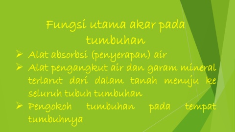 Fungsi utama akar pada tumbuhan ➢ Alat absorbsi (penyerapan) air ➢ Alat pengangkut air dan garam mineral terlarut dari dalam tanah menuju ke seluruh tubuh tumbuhan ➢ Pengokoh tumbuhan pada tempat tumbuhnya