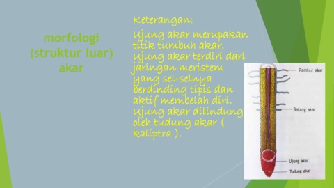 Keterangan: morfologi Ujung akar merupakan (struktur luar) titik tumbuh akar. Ujung akar terdiri dari akar jaringan meristem yang sel-selnya berdinding tipis dan aktif membelah diri. Ujung akar dilindungi oleh tudung akar ( kaliptra ).