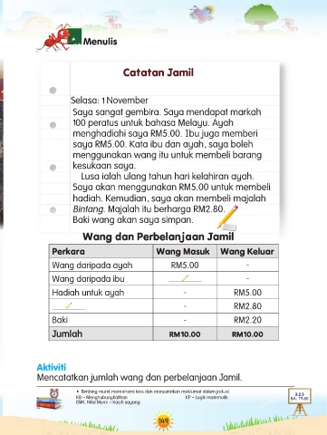 Mencatatkan jumlah wang dan perbelanjaan Jamil.