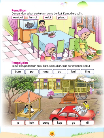 Pemulihan Dengar dan sebut perkataan yang berikut. Kemudian, salin. rambai lantai kaloi pisau Pengayaan Sebut dan padankan suku kata. Kemudian, tulis perkataan tersebut. bum po tang pa bal ting ip kok bung kap ga di 19