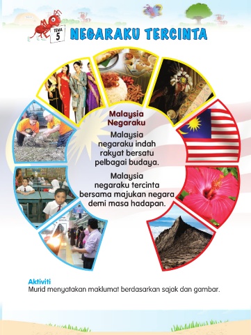 TEMA NEGARAKU TERCINTA 5 Malaysia Negaraku Malaysia negaraku indah rakyat bersatu pelbagai budaya. Malaysia negaraku tercinta bersama majukan negara demi masa hadapan. Aktiviti Murid menyatakan maklumat berdasarkan sajak dan gambar. 77