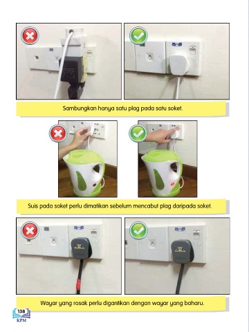 Sambungkan hanya satu plag pada satu soket. Suis pada soket perlu dimatikan sebelum mencabut plag daripada soket. Wayar yang rosak perlu digantikan dengan wayar yang baharu. 138 138