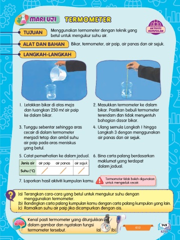 1. Letakkan bikar di atas meja 2. Masukkan termometer ke dalam