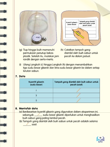 (g) Tiup hingga buih memenuhi (h) Catatkan tempoh yang