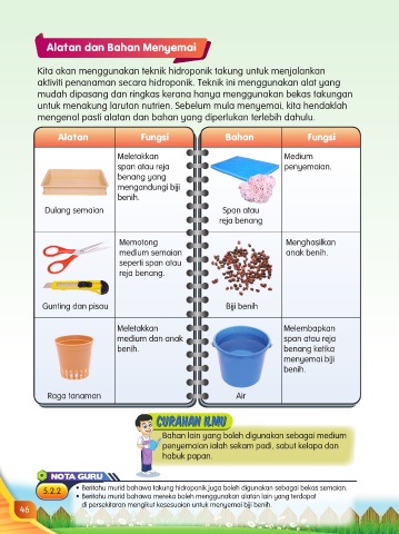 5.2.2 • Beritahu murid bahawa takung hidroponik juga boleh digunakan sebagai bekas semaian.