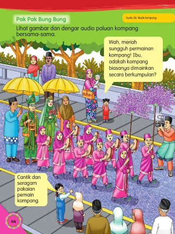 Pak Pak Bung Bung Audio 36: Muzik kompang Lihat gambar dan dengar audio paluan kompang bersama-sama. Wah, meriah sungguh permainan kompang! Ibu, adakah kompang biasanya dimainkan secara berkumpulan? Cantik dan seragam pakaian pemain kompang. 44