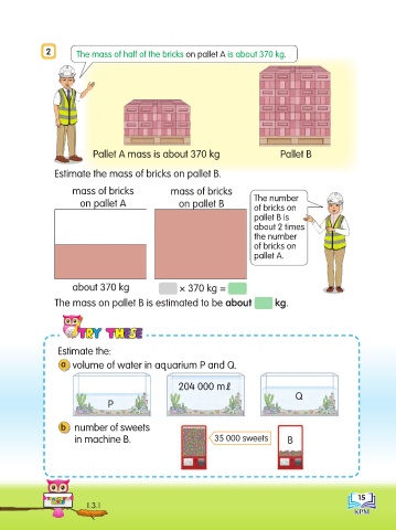 2 The mass of half of the bricks on pallet A is about 370 kg.