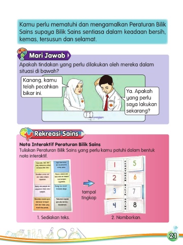Tuliskan Peraturan Bilik Sains yang perlu kamu patuhi dalam bentuk