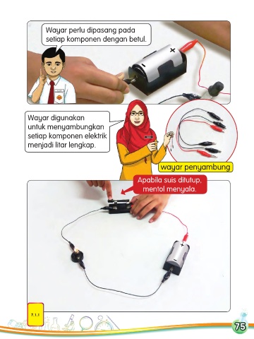 Wayar perlu dipasang pada setiap komponen dengan betul. Wayar digunakan untuk menyambungkan setiap komponen elektrik menjadi litar lengkap. wayar penyambung Apabila suis ditutup, mentol menyala. 7.1.1 75 75 75 BUKU TEKS NE.indb 75 10/11/17 1:17 PM