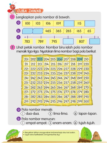 2 Lihat petak nombor. Nombor biru ialah pola nombor