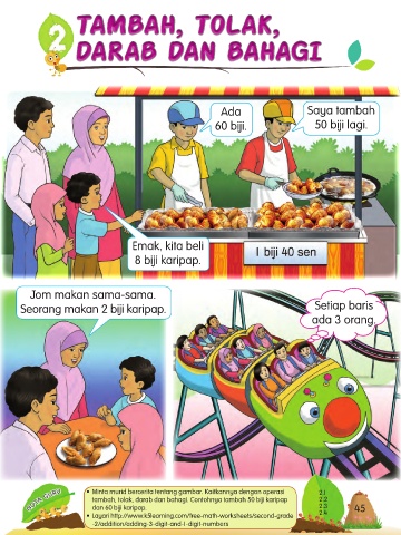 tambah, tolak, darab dan bahagi. Contohnya tambah 50 biji karipap