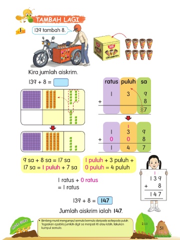 9 sa + 8 sa = 17 sa 1 puluh + 3 puluh +