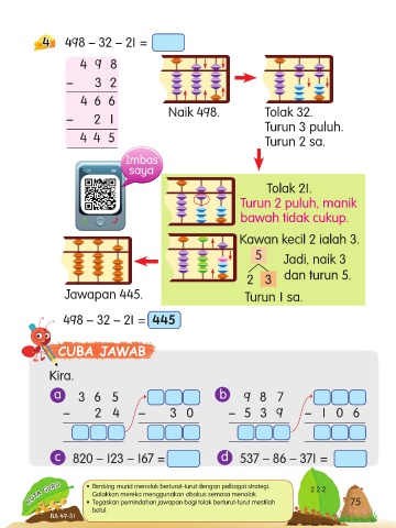 • Tegaskan pemindahan jawapan bagi tolak berturut-turut mestilah
