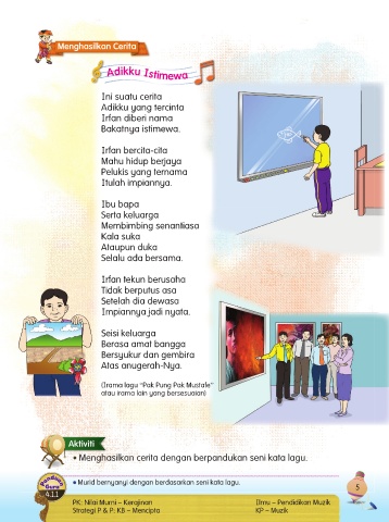 Menulis teks secara mekanis dengan betul dan kemasnya. Menghasilkan cerita dengan berpandukan seni kata lagu.